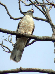 外形描述:中等体型(45厘米)的褐色鹃隼。形长的冠羽常垂直竖起。上体褐色,下体白色具黑色纵纹,胸腹部具赤褐色横纹。与凤头鹰的区别在冠羽长许多,翼尖几乎长及尾尖。飞行时两翼尤其近端处甚长且宽,平尾。