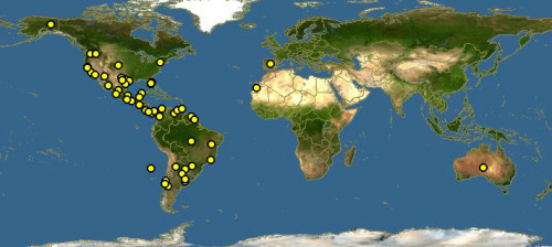 美国的西部和南部(俄勒冈州、佛罗里达州,南卡罗来纳州),墨西哥北部,中美洲最多。 |