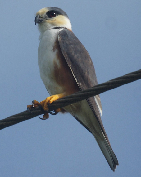 形态特征:珠鸢体长20.3-23厘米,体重80-95克,是美洲最小的猛禽。成鸟有一个黑色的顶冠,上体、双翅和尾部是深灰色。后脖颈有白领,前额和面颊黄色,下体主要是白色,腿黄色。幼鸟类似成鸟,但背部和翅膀羽毛有白色和栗色斑纹。这个物种在飞行中,主体呈现上体的黑色和下体的白色,对比很鲜明。北部湾形成的亚种不同于指名亚种,两翼是棕色。