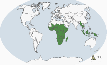 分布范围:分布于安哥拉、贝宁、博茨瓦纳、文莱、布基纳法索、布隆迪、喀麦隆、中非共和国、乍得、科摩罗、刚果、刚果民主共和国、科特迪瓦、赤道几内亚、埃塞俄比亚、加蓬、加纳、几内亚、印度尼西亚、肯尼亚、利比里亚、马达加斯加、马拉维、马来西亚、马里、莫桑比克、缅甸、纳米比亚、尼日尔、尼日利亚、巴布亚新几内亚、卢旺达、塞内加尔、塞拉利昂、索马里、南非、南苏丹、苏丹、坦桑尼亚联合共和国、泰国、多哥、乌干达、赞比亚、津巴布韦。