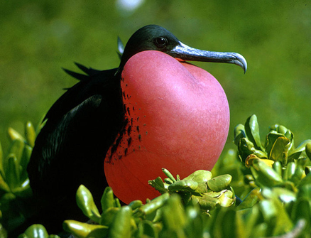 军舰鸟翅极长,尾长呈叉形,飞翔能力强,常常在空中抢夺其它海鸟的食物,其英文名为海盗鸟之意。雄性军舰鸟具鲜红色喉囊,求偶时充气膨大如球形。