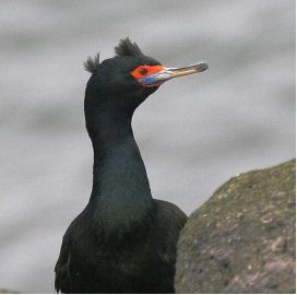红脸鸬鹚(学名:Phalacrocorax urile,英文名:Red-faced Cormorant,命名者几年代:Gmelin, 1789),大型水鸟,体长70~76厘米,体重约2千克。夏羽主要为黑色,头顶和枕部备有一簇彼此分离的冠羽、颜色为黑色,具铜绿色金属光泽,腰股部有一簇长而窄的白色羽毛。冬羽亦为黑色而富有金属光泽。常成小群活动。除晚上和休息时上到岸上外,其他时候几乎在海上活动。营巢于海岸和邻近岛屿的悬岩峭壁上,特别是突出于海中的较为平坦和开阔的悬岩和岩石。常呈分散的小群营巢。巢通常由海草构成。