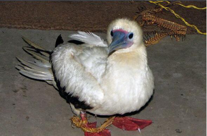 红脚鲣鸟(学名:Sula sula):体长约为68-75厘米。是黑白色或烟褐色鲣鸟。以红脚白尾为其特征,具浅、深及中间3种色型。体色既清新典雅,又鲜艳夺目。身体的羽毛洁白无瑕,仅有部分飞羽为黑色。头部和颈部有黄色的光泽,头顶上缀有少许红色,嘴粗壮,长直而尖,近似圆锥形,上下嘴缘均呈锯齿状。嘴的颜色为淡蓝色,基部为红色。眼睛为黑色。具有发达的脚蹼,使它在水中畅游时得心应手。