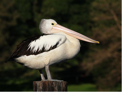 外形特征:澳洲鹈鹕在鹈鹕中算中等身型:长1.6-1.8米,翼展2.3-2.5米,重4-13公斤。它们主要呈白色,双翼的主羽呈黑色。喙呈淡粉红色,在鸟类中是最大的,可以长达49厘米。