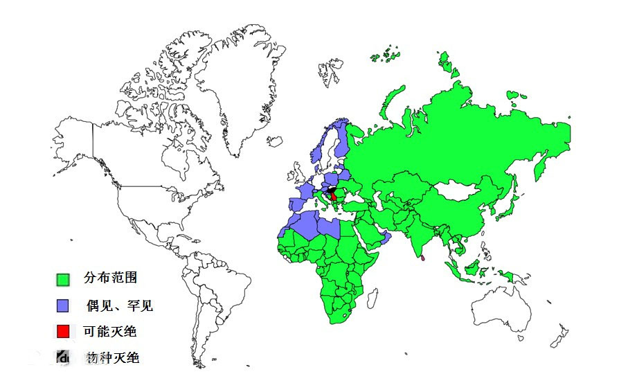 欧洲南部、非洲大部分国家、亚洲中部和南部等地;偶见于欧洲其他地区(西部、北部)、非洲西北部、阿曼及阿联酋等地。塞尔维亚、黑山、斯里兰卡境内近绝迹。匈牙利境内已绝迹。