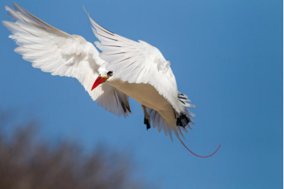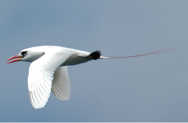 形态特征:红尾鹲是一种中等大小的热带鸟类,通体白色,羽毛具绢丝光泽,繁殖期缀有玫瑰红色。眼及眼的前后黑色,形成一条短的宽眼纹。初级飞羽羽轴黑色,内侧次级飞羽具较宽的黑色中央纹和黑色羽轴。中央两枚尾羽特别长,红色,具黑色羽轴。