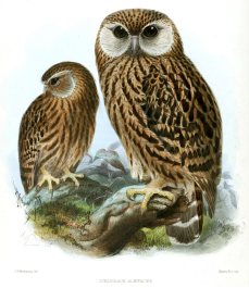 物种概述:笑鸮源自于新西兰,18世纪中期这种鸟类数量变得非常稀少,是新西兰独有一种猫头鹰物种,最终灭绝时间是20世纪30年代。最显著的特点是鸣叫非常像精神病患者的窃笑,由于人类活动破坏笑鸮的栖息环境,使得它们开始改变所吃食物,它们会吞食鸭子、蜥蜴,以及一些小型哺乳动物。
