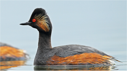 形态特征:黑颈鸊鷉夏羽头、颈和上体黑色;眼后有一族呈扇形散开像头发一样的丝状饰羽,基部棕红色,逐渐变为金黄色;两翅覆羽黑褐色,初级飞羽淡褐色,内侧初级飞羽尖端和内翈白色,逐渐过渡到内外翈全白色;外侧次级飞羽白色,内侧次级飞羽和肩羽黑褐色;胸、腹丝光白色,肛周灰褐色,胸侧和两胁栗红色,缀有褐色斑;翅下覆羽和腋羽白色。