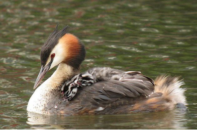 形态特征:凤头鸊鷉是一种游禽。也是体形最大的一种鸊鷉,雄鸟和雌鸟比较相似,有鸭子一样大小,嘴又长又尖,从嘴角到眼睛还长着一条黑线。它的脖子很长,向上方直立着,通常与水面保持垂直的姿势。