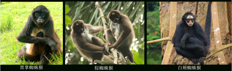 蛛猴属(学名:Ateles):共有7种。头体长约35-66厘米。头又圆又小,四肢细长,手没有拇指。毛茸茸的尾巴约有60-92厘米长,很会抓住树枝,其功能有点像手。尾巴比身体还长,缠绕性极强。能直立行走。它们在树上活动时用细长的四肢纵跃或爬行,还能用长尾巴缠绕在树枝上荡来荡去。群居生活,群体数量可达35只以上。因相当细长的四肢和尾巴宛如蜘蛛而得名。
