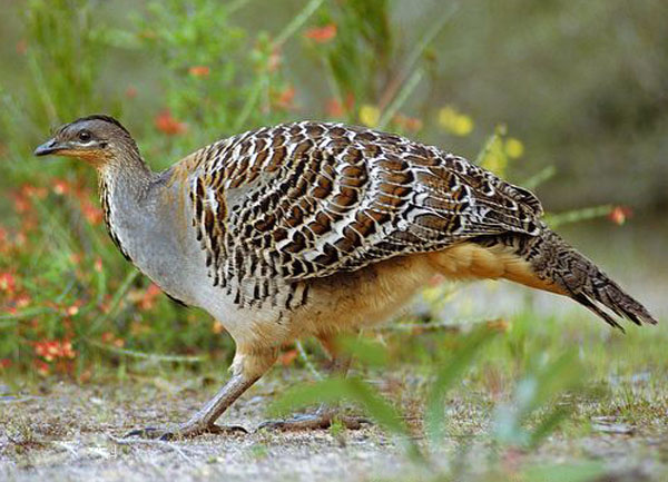 眼斑冢雉(学名:Leipoa ocellata):体长60-65厘米,羽毛呈浅褐色,有许多白斑。它们的脖子很长,且光秃无毛。雄鸟的脸呈火红色,颌下的肉垂呈鲜黄色。