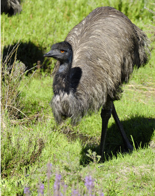 鸸鹋,体高150-185厘米,体重30-45千克,寿命10年。成年雌性比雄性大。鸸鹋形似非洲鸵鸟而较小,属于平胸类,没有龙骨,嘴短而扁,羽毛灰色、褐色或黑色,长而卷曲自颈部向身体的两侧覆盖。翅膀退化,完全无法飞翔。足三趾,腿长善走。羽毛发育不全,具纤细垂羽,副羽甚发达,头、颈有羽毛、无肉垂。体健壮,腿长,同其亲属鹤鸵一样。两性体羽均为褐色,头和颈暗灰,颈部裸露的皮肤呈蓝色,喙为灰色,翅膀隐藏在残留的羽毛下,在炎热的天气,可以促进机体冷却。庞大的身体是由两个强大的灰色的三趾腿支撑。雏鸟有一个蓬松羽毛的头,身体由棕色和黑色条纹的羽毛组成。鸸鹋的奔跑速度每小时最高可达43英里(约合69千米),被困时用三趾的大脚踢人。