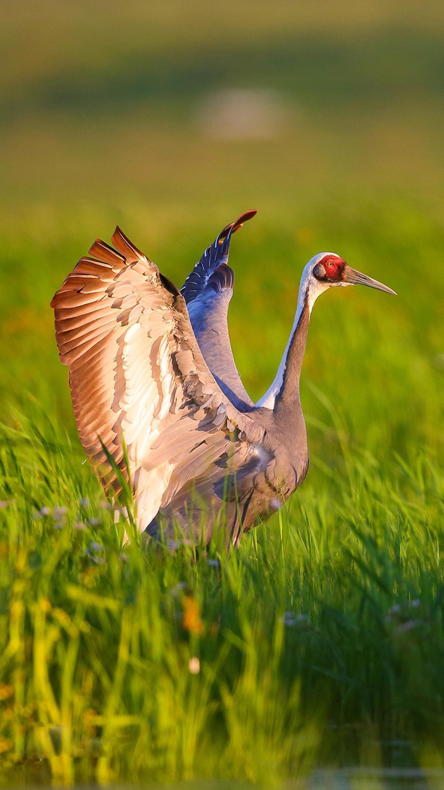 繁殖期5-7月。一雌一雄制,3月末到达繁殖地时即多成对或成家族群活动,雄鸟不时表现出求偶行为。求偶时雄鸟在雌鸟身边兴奋地来回奔走和跳跃,两翅半张或完全张开,并伴随着‘kou-kou-kou’的高声鸣叫。雌鸟若接受雄鸟的求爱,则跟着对鸣和起舞,然后雌鸟展开双翅,身体下蹲,雄鸟即跳到雌鸟背上进行交尾;若雌鸟对雄鸟的求偶表现冷淡或走开,雄鸟即停止求偶表演。营巢于芦苇沼泽或水草沼泽中,水深10-30厘米,有时可达80厘米。由雌雄亲鸟共同营巢,以雌鸟为主。巢呈浅盘状,主要由枯芦三棱草、苔草、莎草和芦苇花、叶构成。巢的大小为直径80-120厘米,巢露出水面高度为7-16厘米。领域性极强,雌雄鸟通过在巢域内的鸣叫、巡飞和追逐飞行等方式来表示对巢域的占有和保卫。领域大小为4.5-6.5平方公里,巢间距平均为2683米。最早于4月上旬开始产卵,一直持续到5月下旬,年产1窝,每窝产卵2枚。卵为随圆形,灰色或淡紫色、密布紫褐色斑点,尤其以钝端较著。卵的大小为90-98毫米×56-63毫米,平均92.9毫米×60.9毫米,重150-205克,平均167克。产出第一枚卵后即开始孵卵,由雌雄亲鸟共同承担,以雌鸟为主。孵卵时另一鸟多在巢附近一边觅食一边警戒,孵卵的亲鸟亦甚警觉,常常伸头观望,稍有惊动,便悄悄地从巢上下来,在走到离巢50米以外之后才突然起飞,使人难于找到巢。通常飞到离巢300米以外的较高处窥视,待入侵者离开后才又飞回巢中孵卵,孵卵期29-30天。雏鸟早成性,孵出的当日即能站立和行走。