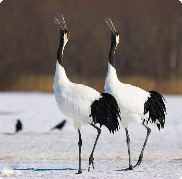 每年3月末4月初,当丹顶鹤到达繁殖地后不久,即开始配对和占领巢域,雄鸟和雌鸟彼此通过在巢域内的不断鸣叫来宣布对领域的占有。求偶时也伴随着鸣叫,而且常常是雄鸟嘴尖朝上,昂起头颈,仰向天空,双翅耸立,引吭高歌,发出“呵,呵,呵”的嘹亮声音。雌鸟则高声应和,然后彼此对鸣、跳跃和舞蹈。舞姿也很优美,或伸颈扬头,或曲膝弯腰,或原地踏步,或跳跃空中,有时还叼起小石子或小树枝抛向空中。