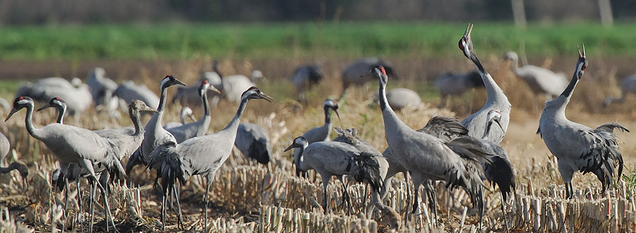 灰鹤(学名:Grus grus)是大型涉禽,体长100-120厘米。颈、脚均甚长,全身羽毛大都灰色,头顶裸出皮肤鲜红色,眼后至颈侧有一灰白色纵带,脚黑色。栖息于开阔平原、草地、沼泽、河滩、旷野、湖泊以及农田地带;其中尤为喜欢以富有水边植物的开阔湖泊和沼泽地带。主要以植物叶、茎、嫩芽、块茎、草子、玉米、谷粒、马铃薯、白菜、软体动物、昆虫、蛙、蜥蜴、鱼类等食物为食。春季于3月中下旬开始往繁殖地迁徙,秋季于9月末10月初迁往越冬地。迁徙时常为数个家族群组成的小群迁飞,有时也成40-50只的大群,繁殖期4-7月。每窝通常产卵2枚,雌雄轮流孵卵,孵化期28-30天。在世界范围内,繁殖在欧亚大陆北部;其越冬地在法国,阿拉伯半岛,非洲西北部和东北部,中东,巴基斯坦,印度以及中国的东部和南部,偶见于朝鲜半岛,日本和北美西部。越冬在非洲北部、伊朗、印度、缅甸和中南半岛北部。