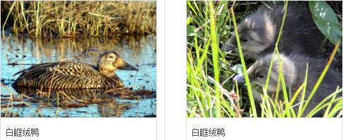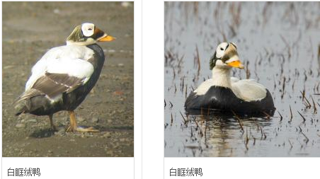 白眶绒鸭(学名:Spectacled Eider)是属于鸭科的一种很具特色的水鸭。雄鸭眼睛周围有黑眼眶,雌鸭为棕色。跗鳞盾片状;雄体气管有不对称的膨大部;两者鸣声不同,通常羽衣及行为亦异;配偶关系及家庭生活维持时间短;一年换羽2次;雄体常换“蚀羽”及鲜艳的婚羽各1次;幼雏的绒羽有明显花纹;雌体有“逗引”表演。体圆羽毛丰满,以适应北极的严寒。杂食性,以水生动物:鱼、甲壳动物和软体动物为食,也吃植物类。