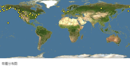 帝雁分布区仅限于白令海,在北极和亚北极的美国极东北端阿拉斯加繁殖,越冬从东部沿海至俄罗斯。