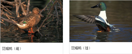 琵嘴鸭雄鸟头、颈暗绿色;额、眼、头顶、颏和喉较深暗,呈黑褐色。背暗褐色,具淡棕色羽缘;上背两侧和外侧肩羽白色,其余肩羽除2枚较长的内侧肩羽外翈为蓝灰色外,均为黑褐色,并闪绿色光彩,中间有一条宽的白色羽轴纹,沿羽干直达羽尖。腰暗褐色,微具绿色光泽;腰两侧白色,尾上覆羽金属绿色,中央尾羽暗褐色,具白色羽缘。外侧尾羽白色,具稀疏的褐色斑点。翅上小覆羽和中覆羽灰蓝色;大覆羽暗褐色,具白色端斑。初级飞羽暗褐色,羽干白色;次级飞羽外翈翠绿色,形成绿色翼镜,内翈暗褐色,端斑白色,形成翼镜后缘白边,前缘白边由大覆羽白色端斑构成;三级飞羽黑褐色,具绿色光泽和宽阔的白色中央纹。下颈和胸白色,并向上扩展到背侧与背两侧的白色相连为一体。两胁和腹栗色,下腹微具褐色波状细斑。较短的尾下覆羽基部白色而有黑色细斑,端部黑色;较长的呈纯黑色,仅羽端有细小白色斑点。