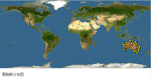 栗胸鸭(学名:Anas castanea )是雁形目鸭科的鸟类。体长38-46厘米,体重505-766克,是澳洲几种最常见的鸭子之一。雌雄鸟羽色不同,雄鸭颜色较鲜艳,胸腹部为栗红色,而雌鸭颜色暗淡,属于典型的雌鸭羽色。栖息河口湿地和海岸附近,是能够成功地经受住高盐度水域的数种鸭子之一。分布于淡水湖泊,水库和人工处理的废水池塘。以植物为主食,有时也吃动物性食物。分布于澳大利亚和新西兰。
