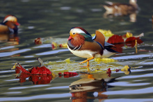 鸳鸯(学名:Aix galericulata):鸳指雄鸟,鸯指雌鸟,故鸳鸯属合成词。属雁形目的中型鸭类,大小介于绿头鸭和绿翅鸭之间,体长38-45厘米,体重0.5千克左右。雌雄异色,雄鸟嘴红色,脚橙黄色,羽色鲜艳而华丽,头具艳丽的冠羽,眼后有宽阔的白色眉纹,翅上有一对栗黄色扇状直立羽,像帆一样立于后背,非常奇特和醒目,野外极易辨认。雌鸟嘴黑色,脚橙黄色,头和整个上体灰褐色,眼周白色,其后连一细的白色眉纹,亦极为醒目和独特。