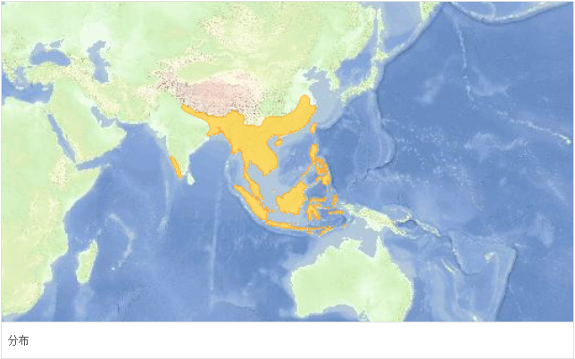 世界分布:孟加拉、不丹、文莱、柬埔寨、中国、印度、印度尼西亚、老挝、马来西亚、缅甸、尼泊尔、菲律宾、新加坡、泰国、东帝汶、越南。