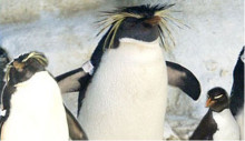 外型特色 跳岩企鹅的头顶上有个明亮的冠子,与同属的马可罗尼企鹅十分相似,但它头上金黄色的羽毛左右并不相连,而且马可罗尼企鹅比较肥。