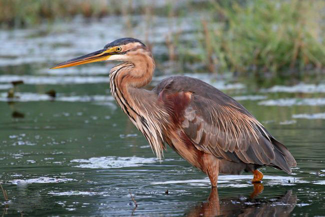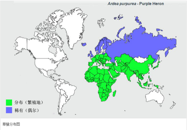 草鹭(学名:Ardea purpurea)是大、中型涉禽,体形呈纺锤形,草鹭的额和头顶蓝黑色,枕部有两枚灰黑色长形羽毛形成的冠羽,悬垂于头后,状如辫子,胸前有饰羽。具有“三长”的特点,即喙长、颈长、腿长。腿部被羽,胫部裸露,脚三趾在前一趾在后。没有明显的嗉囊,食道中部膨大,整个食道都能储存食物。飞时头颈弯曲。选择固定的地点筑巢,主要栖息于开阔平原和低山丘陵地带的湖泊、河流、沼泽、水库和水塘岸边及其浅水处,特别是生长有大片芦苇和水生植物的水域最为喜欢。常成小群栖息于稠密的芦苇沼泽地上或水域附近灌丛中,主要以小鱼、蛙、甲壳类、蜥蜴、蝗虫等动物性食物为食。寿命25年。分布于中国,印度,伊朗,欧洲南部,非洲及马达加斯加岛等地。
