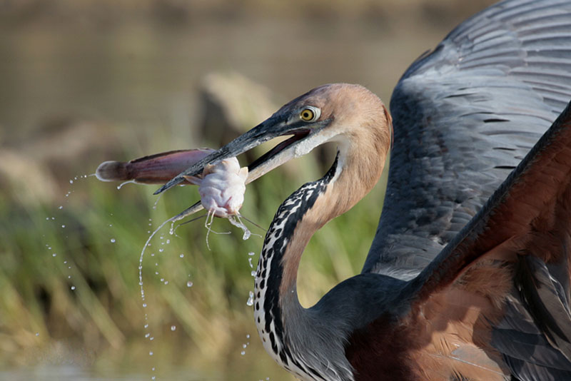 巨鹭(学名:Ardea goliath):是世界上最大的鹭科鸟类,体高1.20-1.52米,翼展阔1.85-2.30米,体重4-5千克。雄鸟及雌鸟长相相近,整体呈灰色及栗色。冠、面部、背部及颈部两侧都是栗色的。下巴、喉咙、前颈及上胸都是白色的,在前颈及上胸间有黑色斑纹。下胸及腹部都是浅黄色,有黑色斑纹。上颌黑色,眼睛部分是黄绿色的。双脚是黑色的。雏鸟像成鸟,但较淡色。