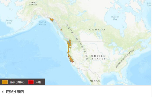 国家:加拿大(不列颠哥伦比亚省)、墨西哥、美国(加利福尼亚州、阿拉斯加、俄勒冈州)。