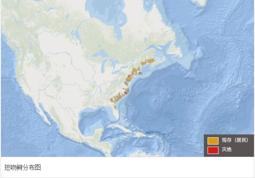 短吻鲟是分布在北美东海岸的两种鲟类之一,另一种是大西洋鲟,两者相伴分布。与大西洋鲟相比,短吻鲟个体较小,分布范围较窄,且极少进入海水水域,是目前唯一确定的咸淡水洄游型鲟类。栖息环境