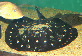 又称:假黑白魟 据AQUALOG的鉴别目录“淡水魟(Freshwater Rays)”上简称代号P12.和黑白魟极为类似.主要产地在巴西.只是河域不同.容易饲养的入门鱼种.最大个体可达60CM.金点魟和黑白魟最大的差异:1.金点魟的体色较偏褐色.2.而点多为金黄色点比黑白多且乱.3.体盘的正负两面外围有碎金点环绕,腹部有明显斑点.4.皮肤表皮有明显疣状秃起物,为粗糙面,黑白则为绒质表皮.
