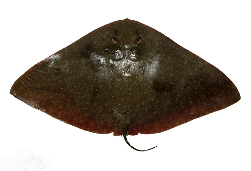 体盘宽大,呈斜方形,宽比长大于2倍,大于全长1.3倍。尾短而细小,约等于体长1/2。吻短,前端稍突出。眼小,约等于眼间隔1/3。眼间隔宽平,比吻长为大。喷水孔比眼大。前鼻瓣宽大,连合成一扁长方形口盖,未伸达口隅。口中大,横列,口宽大于口前吻长。口底无乳突。齿细小密列。齿头细尖。鳃孔小,5个。胸鳍宽大,伸达吻端,外角和里角圆形。腹鳍长方形。无背鳍和尾鳍。体光滑。尾刺短小,1—2个。体背面灰褐色或青褐色,有时具暗色斑块;腹面白色;边缘灰褐色;尾具黑色横纹6—7条。为暖温性近海底栖中小型次要经济鱼类。体长达1m左右。