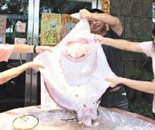 嘉义县竹崎乡海产餐厅“山鱼珍”海钓船在恒春外海捕获一只外型似魟大鱼。店家将其展示在店门口,有饕客被怪鱼吓到,直说“好恐怖,这礼拜不敢吃鱼。”