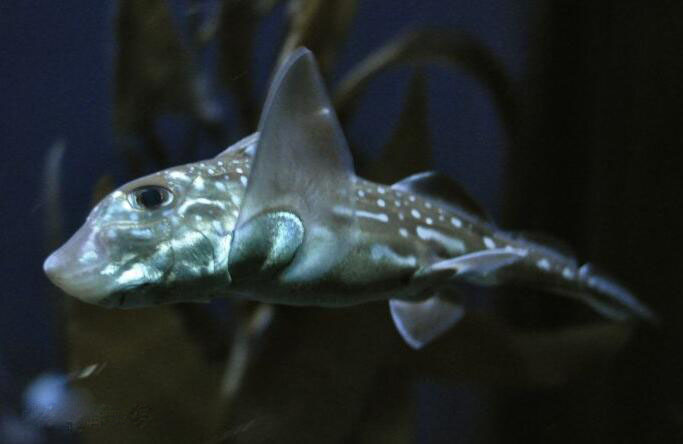 科氏兔银鲛(学名:Hydrolagus colliei)是银鲛科、兔银鲛属鱼类。幼鱼出生时全长14厘米。一般成年体长为36厘米,最大达60厘米。头似兔子,头大,鸭嘴形鼻子宽,眼睛绿。牙齿相对较少。下颚有一对牙齿,而上颚有两对牙齿。身体朝着鱼的尾端逐渐变细。尾巴几乎占整条鱼总长的一半。皮肤光滑,没有鳞片,有明显的侧线管。在第一背鳍的前缘有一个突出的毒刺,它比鳍本身略高,而第二背鳍有一个起伏的轮廓,使它看起来像两个独立的鳍。发育良好的胸鳍呈三角形,基部肉质。雄性头部有一个多刺的棒状突起。它们还具有在腹鳍前面的尖锐的回缩扣合器官,细长扣合器端部靠近每个腹鳍基部,具有扩展的末端。身体是棕色或灰色的,有金色、绿色和蓝色。身体上散布着白色斑点,导致该鱼呈现出虹彩和银色光泽。该鱼的腹面为银色,鳍为灰色。
