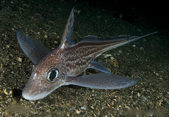 大西洋银鲛,Chimaera monstrosa (Linnaeus, 1758),银鲛科银鲛属的一种鱼类。广泛分布于大西洋,从非洲西海岸至挪威和冰岛海域均有发现。大西洋银鲛体长1.5米,重量2.5公斤,体表棕色,布有白色条纹,眼睛很大呈绿色,背鳍有毒刺。本鱼生活在海下50-1000米的深度,小群活动,行动缓慢,以甲壳类和软体动物为食。