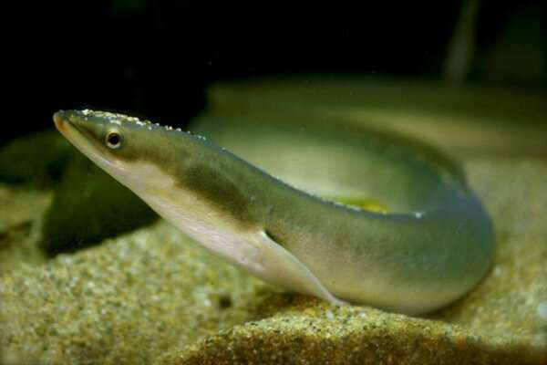 成鱼体长一般300毫米,最大可达1.3米,重达5千克。 体延长,躯干部圆柱形,尾部侧扁。头中等大,尖锥形。吻短而钝。眼较小,卵圆形。眼间隔宽阔,略显平坦。鼻孔每侧2个,前后鼻孔分离;前鼻接近上唇前缘,呈短管状,两侧鼻孔分开较远;后鼻孔位于眼正前方,裂缝状;前后鼻孔之间的距离略小于两前鼻孔间的距离。口大,端位;口裂微向后下方倾斜,后伸达眼后缘的下方;下颌稍长于上颌。齿细小,尖锐,排列成带状;上下颌齿带前方稍宽,具齿4-5行,向后渐减少至2-3行;犁骨齿带前方宽阔,具齿5-6行,向后渐减少至2-3行,呈细锥状向后延伸,后端几伸达上颌齿带后端相对的位置。唇发达。舌游离,基部附于口底。鳃孔中等大,侧位,位于胸鳍上角稍后的下方,呈纵垂直裂缝状。肛门明显位于体中部的前方。