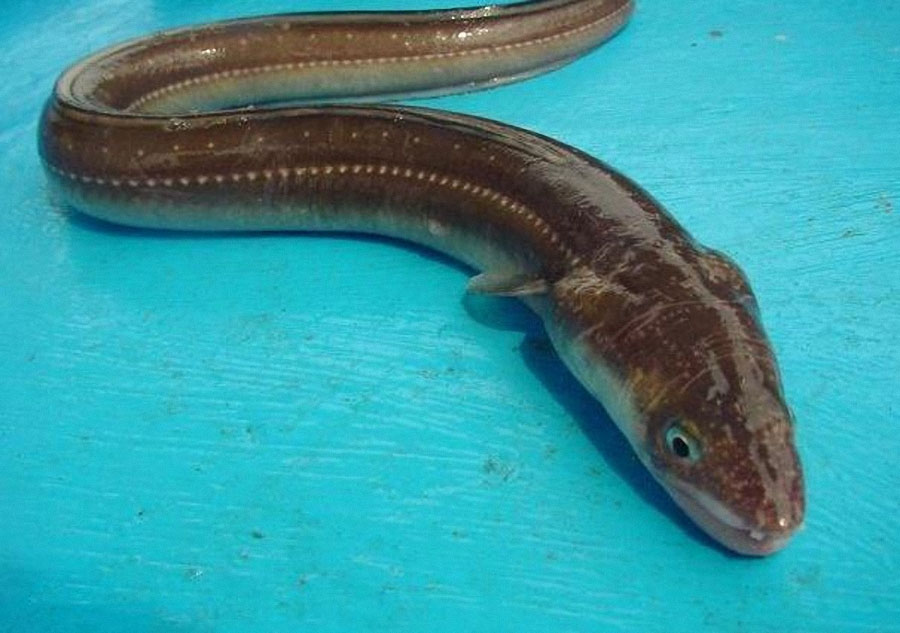 鳗鲡,地方名为白鳝、白鳗、青鳝和鳗鱼,体低而细长,前部近圆筒状,后部侧扁,背鳍、臀鳍和尾鳍相连结,鳞小埋于皮下,为席状排列,侧线发达,体上多粘液,体上部灰黑色,侧上缘绿色,体下白色,原产海水中,溯河到淡水中生长,成熟后又回到海中产卵。