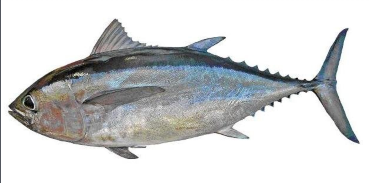 黑鳍金枪鱼(学名:Thunnus atlanticus)是鲭科、金枪鱼属鱼类。黑鳍金枪鱼是一种体型较小的金枪鱼,最大体长100厘米,重量为21千克。平均体长约为50厘米,平均重量为3.2千克。身体健壮,呈梭形,鳞片小而紧密,完全覆盖身体。嘴是斜的,上颌在大眼中心垂直之前终止。胸甲是一种较大的鳞片,在头部后面的身体周围形成一个圆圈。胸鳍中等长,低于第二背鳍的起点。在肛门和背鳍后面有独立的鳍。月形尾鳍底部有短龙骨。黑鳍金枪鱼有一个蓝黑色的背部,灰色到银色的边和白色的腹部。沿着眼睛上部有一条宽的棕色条纹。侧面有一条明显的黄色到金色的侧带,通常在死亡时褪色。位于腹部两侧的小的虹彩区域是银色的。这一区域有时以一排排垂直的淡点为标志,在这两行之间有一个稍长的斑点。背鳍是暗淡的,有青铜色的反光和白色的边缘,而腹鳍通常是灰色的。这些鳍上缺少黄色。然而,背鳍有时会在死亡时褪色为黄色。