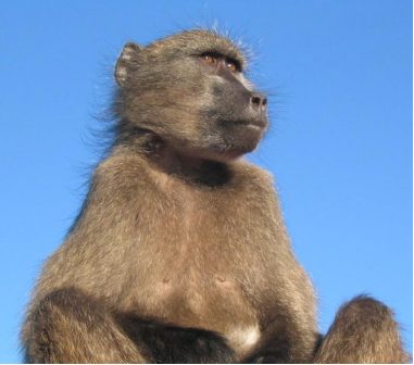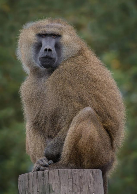 几内亚狒狒(学名:Papio papio):在同属中是体型较小的物种,体重13- 26千克,体长508-1143毫米,尾长456-711毫米。面貌丑陋,雌兽比雄兽小。它的头部较大,眉骨高高突起,棱角分明。两眼漆黑深陷;吻部很长,雌兽的吻稍短;面部皮肤紫黑色,光滑无毛。体毛粗糙,毛色为红棕色,有显著地理变异。具有用于一个中型颅骨,和正面朝向的脸颊。长脸具有突出的吻。成兽有32颗牙齿。犬齿大,雄兽上颚的犬齿长而突出。