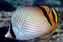 斜纹蝴蝶鱼鱼体色以白色为底色,眼睛上有黑色条纹穿过,在背鳍软条,尾柄、臀鳍软条处为黄色,身上有暗色细斜纹,与人字蝶的区别是这条鱼头部至背鳍的斜纹有6条,而人字蝶只有5条,后半部黄色较深近尾部有1条黑色带,尾鳍黄色,后面有1-2条黑色带,与人字蝶极为相似。常栖息于珊瑚礁区,有强烈的领域性,主要以藻类,珊瑚虫,甲壳类及蠕虫为食。水族箱饲养时可以与大部分蝶鱼混养,不要和凶猛的鱼混养。喜吃藻类、底栖小动物和珊瑚虫,可喂无脊椎动物、藻类和人工饲料。夏~秋天会游到日本千叶县以南的近海。