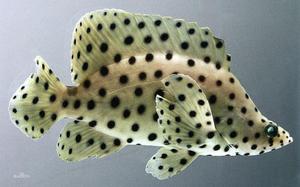 无大牙,一般在45厘米以上,体白色,布满黑点,成鱼体色较深,体上斑纹特别明显,色彩艳丽,行动缓慢,具有抢食性,由于其肉质细嫩,味道特别鲜美,为海产品的名贵鱼之一,在市场上的价格特别昂贵,它是一种高级观赏鱼类,又是一种高级食用鱼类。标准规格:(大)6公斤以上;(小)2公斤以上。