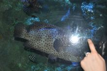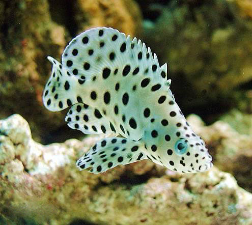 老鼠斑,Cromileptes altivelis (Valenciennes, 1828),鮨科驼背鲈属的一种鱼类,也叫青斑、鰵鱼、驼背鲈。身体为奶油色,黑色斑点布满全身,让人感觉很喜庆。主要分布于印度洋的礁石地区,能长到50厘米。带有斑点的身体能迷惑敌人,保护自己。因容易饲养,所以会长得很快,在确保有足够的生长空间的前提下会很长命,如1500升以上的水族箱或有良好的过滤系统的纯鱼缸。会把任何它能吞掉的任何鱼吃掉,所以要注意分类饲养。在水族箱中,可以饲喂大部分不同的食物,像干的或鲜鱼、鱿鱼、对虾、银鱼等等,为十分珍贵品种。