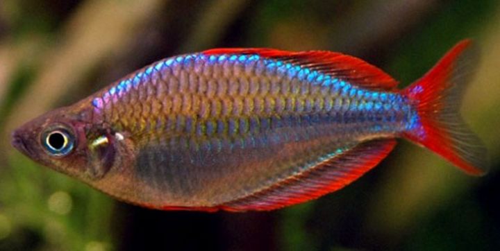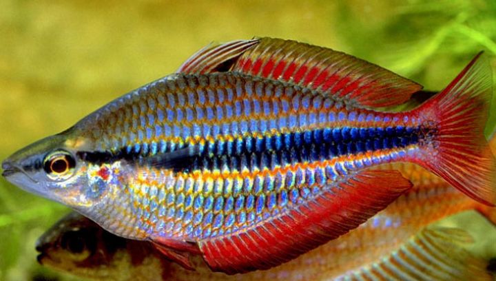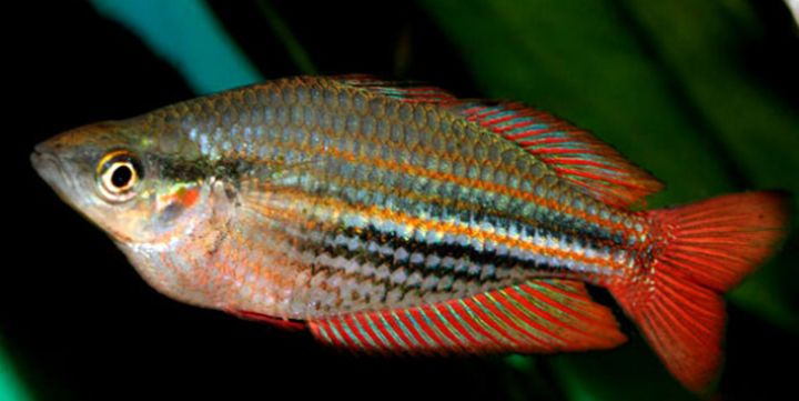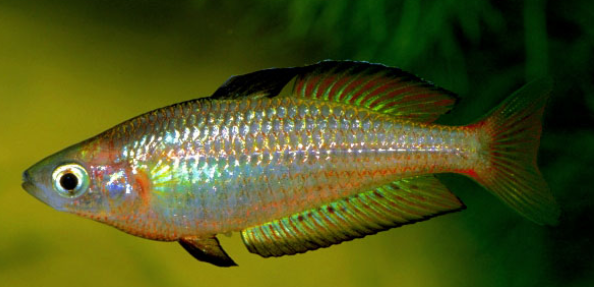 红尾美人鱼,别名澳大利亚虹银汉鱼,为银汉鱼目、银汉鱼科、虹银汉鱼属、银汉系列品种,原产于大洋洲。虹银汉鱼属是该科最大的类群,该科几种大型的知名品种都在这属,澳大利亚虹银汉鱼是老牌观赏鱼了,很早就有鱼缸养殖的记录,兼容型尚好,可以和所有虹银汉鱼混养