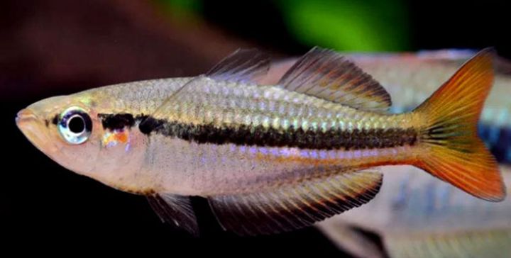黑间美人鱼,为银汉鱼目、银汉鱼科、虹银汉鱼属、银汉系列品种,原产于大洋洲北部广泛分布。体侧中央有1条较粗的黑色横纹贯穿鱼体,有许多不同产地的变异型,市售品种的形态体色多为讨喜的桃红色。曾经是比较少见的彩虹鱼品种,近年进口量稳定,价格也逐步下降