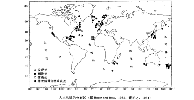 堪察加半岛东部和南部、中国黄海南部、澳大利亚西南、新西兰的北岛东南、南非(东南、南部和西南)、加那利群岛、马德拉群岛、冰岛东部、纽芬兰岛南部和东南、加利福尼亚半岛北部、智利西部海域为抹香鲸胃采获处(其中发现大王乌贼的角质颚或躯体部)。因抹香鲸洄游的长距离性,在其胃中发现的大王乌贼,不一定就是在该海域捕食的,但与大王乌贼的捕获处或搁浅处有联系。