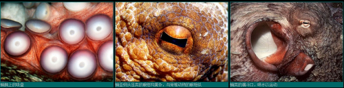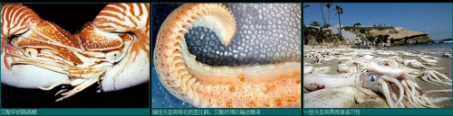 头足类动物身体也是由头、足、内脏囊、外套膜4部分组成,但在体制结构上可分为头、躯干(trunk)及漏斗(funnel)3部分。原始的种类体外有一发达的盘旋外壳,如鹦鹉螺(Nautilus),现存的仅此一属。其他生存种类身体两侧对称、壳不发达形成内壳,如乌贼(Sepia),或壳完全退化消失,如章鱼(Octopus)。头足类动物的身体结构与原软体动物相比,可能随着运动方式由爬行改变成游泳而使身体的背腹轴延长变成了身体的前后轴。结果,头位于身体的前端,内脏囊位于身体后端,原来位于原软体动物背侧的外套膜出现了肌肉层,并延伸包围内脏囊组成躯干部,外套腔由原来位于后部移到了身体的腹面。原来位于原软体动物身体腹面的宽阔的足,也随体轴的改变向前移动,足的一部分构成了头部的腕(或称触手),一部分构成了躯干前端腹面的漏斗,其后端与外套膜游离的腹缘连接后成为外套腔的出水口。纤毛作用在软体动物其他各纲中是重要的,外套膜及栉鳃上的纤毛摆动引起水流过身体,以完成取食、呼吸、排泄、生殖等功能。但头足类的纤毛作用在机能上已被外套膜上发达的肌肉所代替。肌肉的收缩引起水由外套腔口流入,再由漏斗口喷射排出。消化道中的纤毛作用也被肌肉所代替,这与头足类的游泳式运动及掠食习性密切相关。