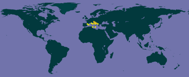 分布于阿尔及利亚、波斯尼亚和黑塞哥维那、克罗地亚、塞浦路斯、埃及、法国、直布罗陀、希腊、以色列、意大利、黎巴嫩、利比亚、马耳他、摩纳哥、黑山、摩洛哥、葡萄牙、圣马力诺、斯洛文尼亚、西班牙、叙利亚、突尼斯和土耳其。
