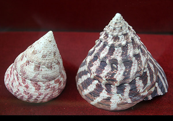钟螺中体形最大、最重的一种,外形几乎呈等边三角形。大多数成贝的螺层除一些细斜纹外,大致光滑;中贝及所有幼贝螺层,都有管状小结节,有的在浅缝合线处形成凹槽。螺轴上有脊状齿。壳表浅粉红白色,有深红色宽斜条纹。(注:曾是制造纽扣的材料,现今仍有少量用来制作装饰品。)