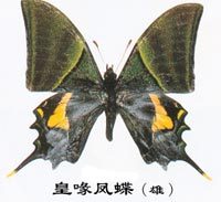 金带喙凤蝶(Teinopalpus imperialis Hope,1843)是昆虫纲鳞翅目凤蝶科喙凤蝶属的下属种喙凤蝶的俗称,又称皇喙凤蝶,是世界上非常珍稀的蝶类昆虫之一。 本种形态与金斑喙凤蝶极相似,唯独后翅的金黄色斑呈带状,故又名金带喙凤蝶。该种蝶身体、翅面大部分翠绿色,雌雄异型。雄蝶前翅基半部色深,以外侧黄绿色而内侧黑色的横纹分界,是观赏的佳品。喙凤蝶主要寄生在木兰科(Magnoliaceae)的滇藏木兰Magnolia campbelii。