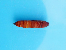 长 15~18毫米,红褐色或黄褐色,纺锤形,。腹部背面1-7节有横皱纹,3-7节有褐色小齿,横列,5-6节腹面各有腹足遗迹1对。尾端臀棘黑褐色,尖端有5-8根钩刺,缠连于丝上,粘附于虫道蛹室内壁。